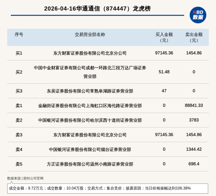 每经讯,2026年4月16日,新三板创新层公司华通通信(874447,收盘价:0.97元)登上龙虎榜,交易方式是集合竞价,披露原因是当日价格振幅达到106.38%,成交数量10.04万股,成交金额9.72万元。买一席位为东方财富证券股份有限公司北京分公司,买入9.71万元;卖一席位为金融街证券股份有限公司上海虹口区海伦路证券营业部,卖出8.88万元。